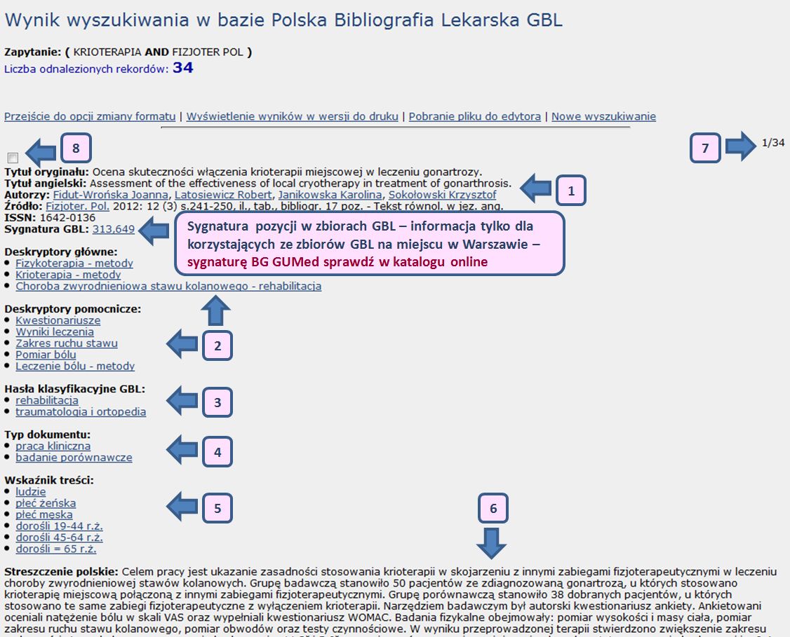 sygnatura GBL (informacja tylko dla korzystających ze zbiorów Głównej Biblioteki Lekarskiej w Warszawie) - sygnaturę naszej Biblioteki należy sprawdzić w katalogu online BG GUMed.