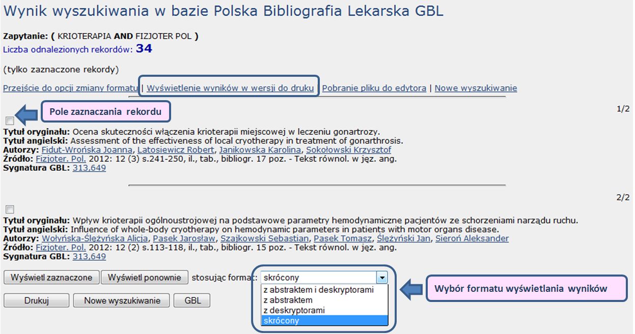 Wybrane rekordy, po zaznaczeniu ich, można wydrukować (opcja Wyświetlenie wyników w wersji do wydruku) albo zapisać na dysku - korzystając z menu przeglądarki lub z opcji Pobranie pliku do edytora, która umożliwia zapisanie pliku w formacie RTF. W tym celu należy: