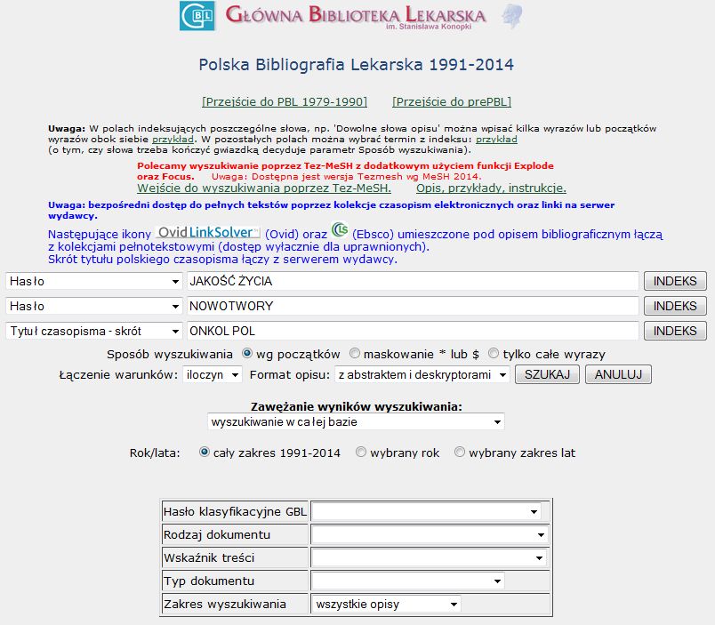 Wyszukiwanie w bazie PBL można prowadzić wpisując w poszczególnych wierszach formularza odpowiednie do wybranej opcji terminy wyszukiwawcze.